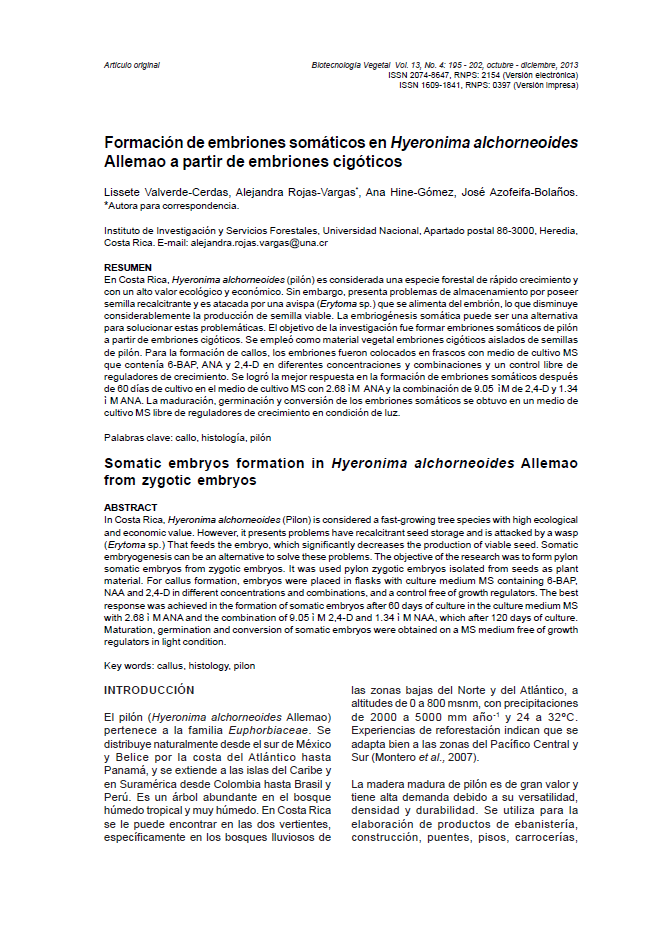 Ítem Can Terrestrial Laser Scanners (TLSs) and Hemispherical Photographs Predict Tropical Dry Forest Succession With Liana Abundance?(Copernicus Publications, 2017-03-02) Sánchez Azofeifa, Gerardo Arturo; Guzmán-Quesada, J. Antonio; Vega-Araya, Mauricio; Campos-Vargas, Carlos; Durán, Sandra Milena; D'Souza, Nikhil; Gianoli, Thomas; Portillo-Quintero, Carlos; Sharp, IainLos bosques secos tropicales (BST) son ecosistemas con largos períodos de sequía, una temperatura media de 25 °C, una precipitación media anual que oscila entre 900 y 2000 mm y una alta abundancia de especies caducifolias (árboles y lianas). Lo que queda de la extensión original de los BST en América se mantiene altamente fragmentado y en diferentes niveles de sucesión ecológica. Se estima que una de las principales huellas del cambio climático y ambiental global en ambientes tropicales es el aumento de la cobertura de lianas. Las lianas son elementos no estructurales del dosel forestal que eventualmente matan a sus árboles hospedantes. En este trabajo evaluamos el uso de un escáner láser terrestre (TLS) en combinación con fotografías hemisféricas (HP) para caracterizar los cambios en la estructura del bosque en función de la sucesión ecológica y la abundancia de lianas. Implementamos un sistema de TLS y HP en 28 parcelas a lo largo de bosques secundarios de diferentes edades y con diferentes niveles de abundancia de lianas. Mediante un análisis de correlación canónica (ACC), abordamos cómo VEGNET, un escáner láser terrestre, y los HP podrían predecir la estructura del BTS. Asimismo, mediante análisis univariados de correlaciones, mostramos cómo la abundancia de lianas podría afectar la predicción de la estructura del bosque. Nuestros resultados sugieren que los TLS y los HP pueden predecir las diferencias en la estructura del bosque en diferentes etapas sucesionales, pero que estas diferencias desaparecen a medida que aumenta la abundancia de lianas. Por lo tanto, en ecosistemas bien conocidos como el bosque seco tropical de Costa Rica, estos sesgos de predicción podrían considerarse efectos estructurales de la presencia de lianas. Esta investigación contribuye a la comprensión de los efectos potenciales de las lianas en los bosques secos secundarios y destaca el papel de los TLS combinados con los HP en el monitoreo de los cambios estructurales en los BTS secundarios.Ítem Sistemas silvopastoriles y cambio climático: estimación y predicción de biomasa arbórea(Universidad Nacional, Costa Rica, 2019-03-01) Jiménez Ruíz, Edwin Rolando; Fonseca González, William; Pazmiño Pesantez, LeticiaEn este trabajo se cuantificó la biomasa y el carbono almacenado en la cobertura vegetal de un sistema silvopastoril compuesto por pasto (Hyparrhenia rufa) y guasmo (Guazuma ulmifolia) establecido en forma natural en el cantón Balzar de la provincia del Guayas en Ecuador. A través del método destructivo y con un muestreo aleatorio por medio de parcelas anidadas, se evaluó la cantidad de biomasa arbórea y subterránea de árboles de diámetro promedio, la necromasa y la vegetación herbácea. Se desarrollaron modelos para estimar la biomasa del árbol completo y sus componentes (tronco, raíz, ramas y hojas) y el volumen. La biomasa arbórea es de 16.45 Mgha-1 (8.23 MgC ha-1) y el aporte de la vegetación herbácea y la necromasa de 1.4 y 1.9 Mg ha-1 (0.7 y 0.95 Mg C ha-1), respectivamente. Los modelos predicen la biomasa y el volumen en función del diámetro con errores de estimación o sesgos menores al 3% y mostraron ajustes (R2) mayores a 96%. Adicionalmente, se generó información sobre factores de expansión de biomasa.Ítem Nutrient concentration age dynamics of teak (Tectona grandis L.f.) plantations in Central America(Instituto Nacional de Investigación y Tecnología Agraria y Alimentaria, 2013-02-04) Fernandez-Moya, J.; Murillo, R.; Portuguez, E.; Fallas, J. L.; Rios, V.; Kottman, F.; Verjans, J. M.; Mata, R.; Alvarado, A.Aim of study: Appropriate knowledge regarding teak (Tectona grandis L.f.) nutrition is required for a better management of the plantations to attain high productivity and sustainability. This study aims to answer the following questions: How can it be determined if a teak tree suffers a nutrient deficiency before it shows symptoms? Are nutrient concentration decreases in older trees associated with age-related declines in forest productivity? Area of study: Costa Rica and Panama. Material and methods: Nutrient concentration in different tree tissues (bole, bark, branches and foliage) were measured at different ages using false-time-series in 28 teak plantations. Research highlights: Foliar N concentration decreases from 2.28 in year 1 to 1.76% in year 19. Foliar Mg concentration increases from 0.23 in year 1 to 0.34% in year 19. The foliar concentrations of the other nutrients are assumed to be constant with tree age: 1.33% Ca, 0.88% K, 0.16% P, 0.12% S, 130 mg kg–1 Fe, 43 mg kg–1 Mn, 11 mg kg–1 Cu, 32 mg kg–1 Zn and 20 mg kg–1 B. The nutrient concentration values showed can be taken as a reference to evaluate the nutritional status of similar teak plantations in the region. The concentrations of K, Mg and N could be associated with declines in teak plantation productivity as the plantation becomes older. Whether age-related changes in nutrient concentrations are a cause or a consequence of age-related declines in productivity is an issue for future research with the aim of achieving higher growth rates throughout the rotation period.Ítem Verifying the geographic origin of mahogany (Swietenia macrophylla King) with DNA-fingerprints(ELSEVIER, 2012) Degen, B.; Ward, S. E.; Lemes, M. R.; Navarro, C.; Cavers, S.; Sebbenn, A.Illegal logging is one of the main causes of ongoing worldwide deforestation and needs to be eradicated. The trade in illegal timber and wood products creates market disadvantages for products from sustainable forestry. Although vario