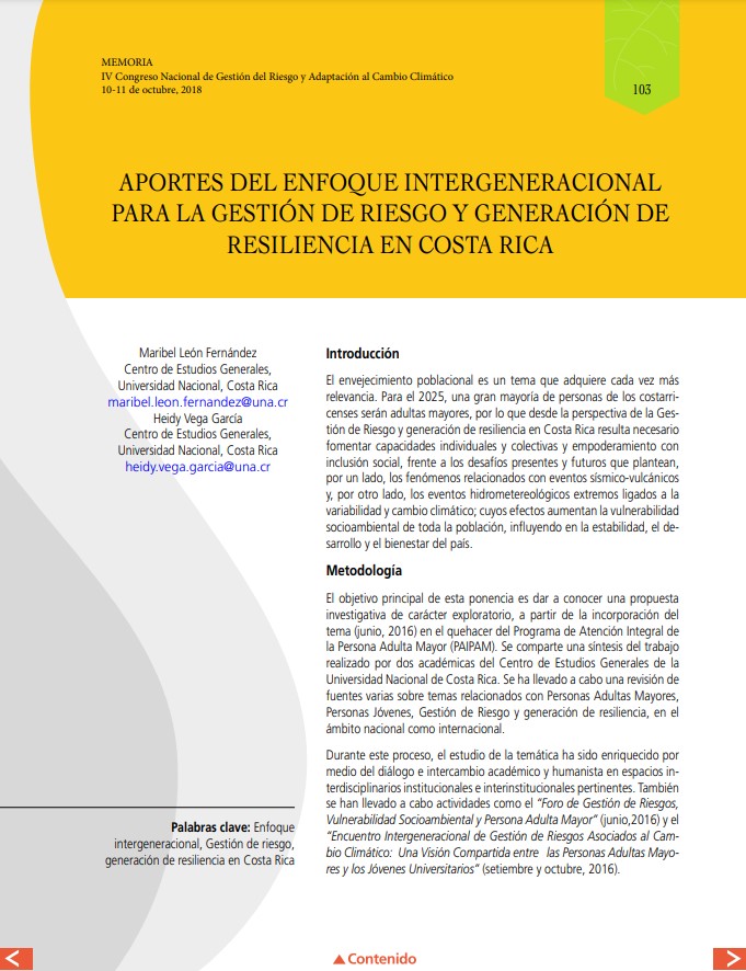 Ítem La Gestión de Riesgo desde un abordaje intergeneracional: cómo fortalecer la participación efectiva de las Personas Adultas Mayores y los jóvenes(Universidad Nacional, Costa Rica, 2017) Vega, Heidy; León, MaribelPartiendo de la premisa de que cualquier persona, grupo o comunidad puede ser vulnerable, es necesario resaltar que la Gestión de Riesgo debe incluir de forma activa y participativa a las Personas Adultas Mayores y a los jóvenes. El Plan Nacional de Gestión del Riesgo de Costa Rica (2010) menciona la importancia de la participación activa de todos los sectores, con un enfoque de adaptabilidad y aumento de la resiliencia local, regional y nacional, visualizando aquellos grupos de mayor vulnerabilidad social como personas con discapacidad, adultos mayores, indígenas y demás poblaciones vulnerables. Este es un tema muy relevante: en el Siglo XXI muchas sociedades envejecen. Por lo que se debe superar los estereotipos, fomentar capacidades individuales y colectivas y empoderamiento con inclusión social, ya que las Personas Adultas Mayores han acumulado gran experiencia durante la vida la cual pueden compartir con los jóvenes. Se debe abrir los espacios participativos en tomas de decisiones y elaboración de políticas públicas para las Personas Adultas Mayores y los jóvenes para se que generen más procesos participativos y educativos que los incluyan. Es imperativo aprender a reconocer sus experiencias de vida y las responsabilidades que pueden asumir y comprender que las Personas Adultas Mayores siguen teniendo muchas funcionalidades y que su longevidad no es sinónimo de discapacidad, improductividad o dependencia, sino más bien de experiencia que puede guiar a los jóvenes, mediante un abordaje intergeneracional.Ítem MEMORIA IV Congreso Nacional de Gestión del Riesgo y Adaptación al Cambio Climático: Aportes del enfoque intergeneracional para la gestión de riesgo y generación de resiliencia en Costa Rica(Universidad Nacional, Costa Rica, 2018-10) Leon Fernández, Maribel; Vega García, HeidyLos estudios sobre la vulnerabilidad social en las personas adultas mayores en Costa Rica es limitada, por ello se necesita la integración de manera efectiva de las personas adultas mayores con las personas jóvenes en las políticas de gestión de riesgo. Se propone un intercambio de conocimientos donde se fortalezca tanto la gestión de riesgo como la resiliencia del país.Ítem Reflexiones sobre los retos de la degradación y la desertificación en las zonas secas de Centroamérica: ¿Cómo adaptarnos para proteger nuestro Patrimonio Natural y Cultural?(Universidad Nacional, Costa Rica, 2016) Vega García, HeidyEsta ponencia reflexiona sobre el problema de las sequías en Centroamérica y destaca algunas soluciones de adaptación, considerando principalmente los temas de variabilidad y cambio climático que constituyen una grave amenaza para la estabilidad del Patrimonio Natural y Cultural.Ítem Hacia la ruta de la inclusión etarea.(Universidad Nacional, Costa Rica, 2022) Alpizar Jimenez, IdaliaEl quehacer de La Universidad Nacional durante sus primeros años estuvo enfocado en consolidar el ideal de ser la universidad necesaria. Aunque todavía sus acciones no contemplaban iniciativas en torno a las personas adultas mayores. Incluso en su reseña histórica que se presenta en la página de transparencia de la UNA, se mencionan una serie de hechos significativos de ese devenir, pero se omite mencionar la creación del Programa de Atención Integral de la Persona Adulta Mayor. Fue alrededor de la década de los años 90, cuando un grupo de profesionales nos planteamos la importancia de acercarnos a poblaciones que etariamente estaban excluidas y discriminadas.Ítem Los desechos de camarón en el sector de Puntarenas, Costa Rica: Estudio ambiental orientado a la cuantificación y clasificación de subproductos en los sitios de mayor producción(Universidad Nacional, Costa Rica, 2012) Chavarría Solera, FabiánEl presente estudio formó parte de un proyecto financiado por el Consejo Nacional para Investigaciones Científicas y Tecnológicas (CONICIT), el cual consistió en la verificación de los puntos de generación y cuantificación de las cantidades de desechos producidos por la actividad pesquera camaronera que pudieran ser de utilidad para el aprovechamiento en la producción de quitina. Se llevó a cabo una investigación de campo y bibliográfica en el marco de un estudio ambiental, para ello se visitó y verificó los sitios de mayor producción de producto camaronero, lugares en donde se obtienen las mayores cantidades de desechos relacionados al mismo. Se elaboro y aplicó una encuesta como documento de análisis para cada empresa dedicada al procesado de camarón, pudiéndose obtener las cantidades de material procesado y estimarse el total de desecho generado en cada procesadora, así como la evaluación en cuanto a los planes de manejo ambiental y diagnostico del actual manejo de los desechos implementados en cada centro de procesamiento. También se zonificó geográficamente los sitios de mayor producción mediante sistema de posicionamiento global GPS.Ítem La manipulación del producto pesquero a bordo de las embarcaciones: Estudio del efecto en la conservación de la frescura y la composición química de la corvina picuda(Universidad Nacional, Costa Rica, 2012) Chavarría Solera, FabiánLa principal preocupación que deben tener los comerciantes de alimentos, entre ellos los pescadores es la distribución de sus productos en condiciones que permitan su consumo sin que ello suponga un riesgo para la salud de consumidor, es decir, todo manipulador de alimentos debe preocuparse de que sus alimentos proporcionados sean inocuos y seguros. Una adecuada manipulación es clave para la consecución de dicho objetivo, impidiendo la alteración o deterioro del alimento, conservando su calidad y valor nutritivo por más tiempo. El presente proyecto pretend