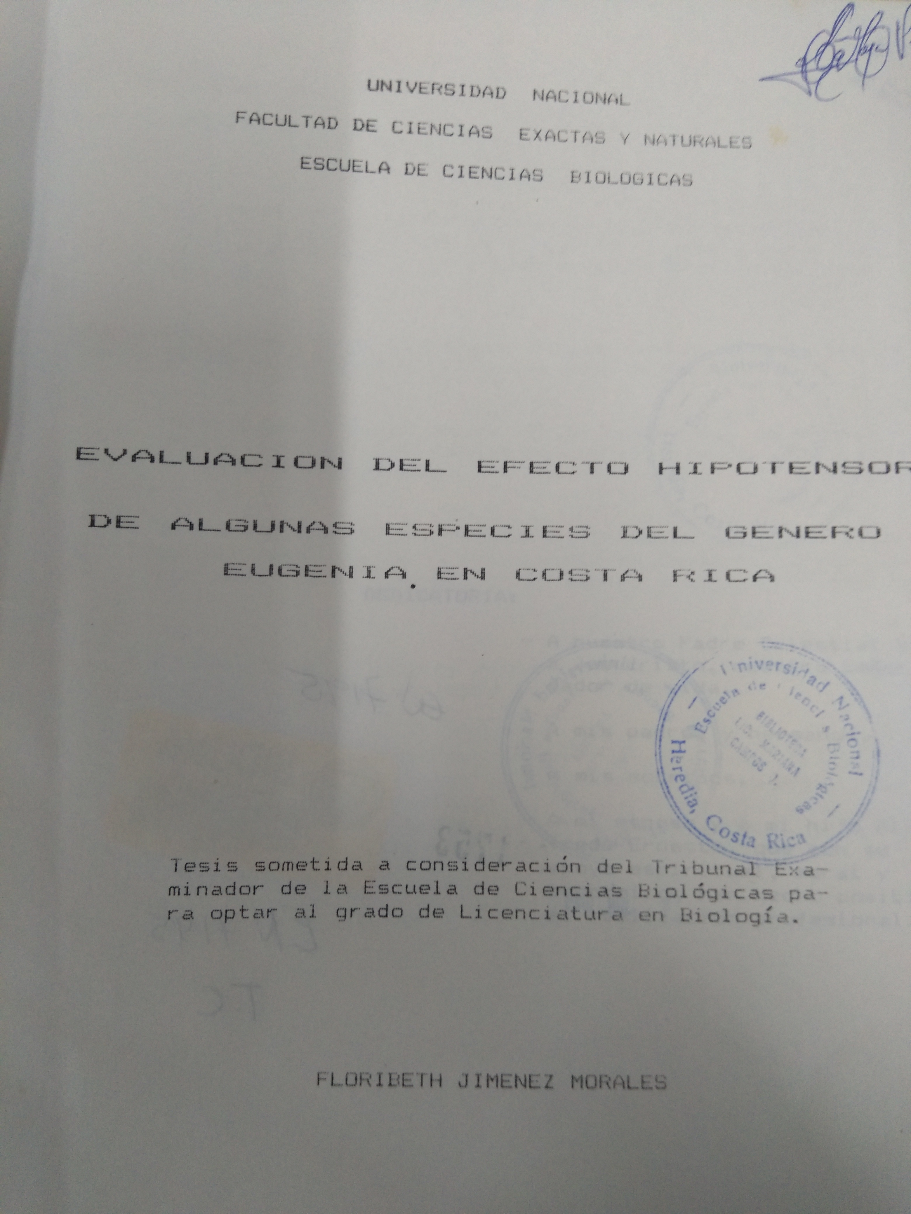 Jiménez, F. (1985). Evaluación del efecto hipotensor de algunas especies del género Eugenia en Costa Rica. Tesis de Licenciatura. Universidad Nacional: Costa Rica.