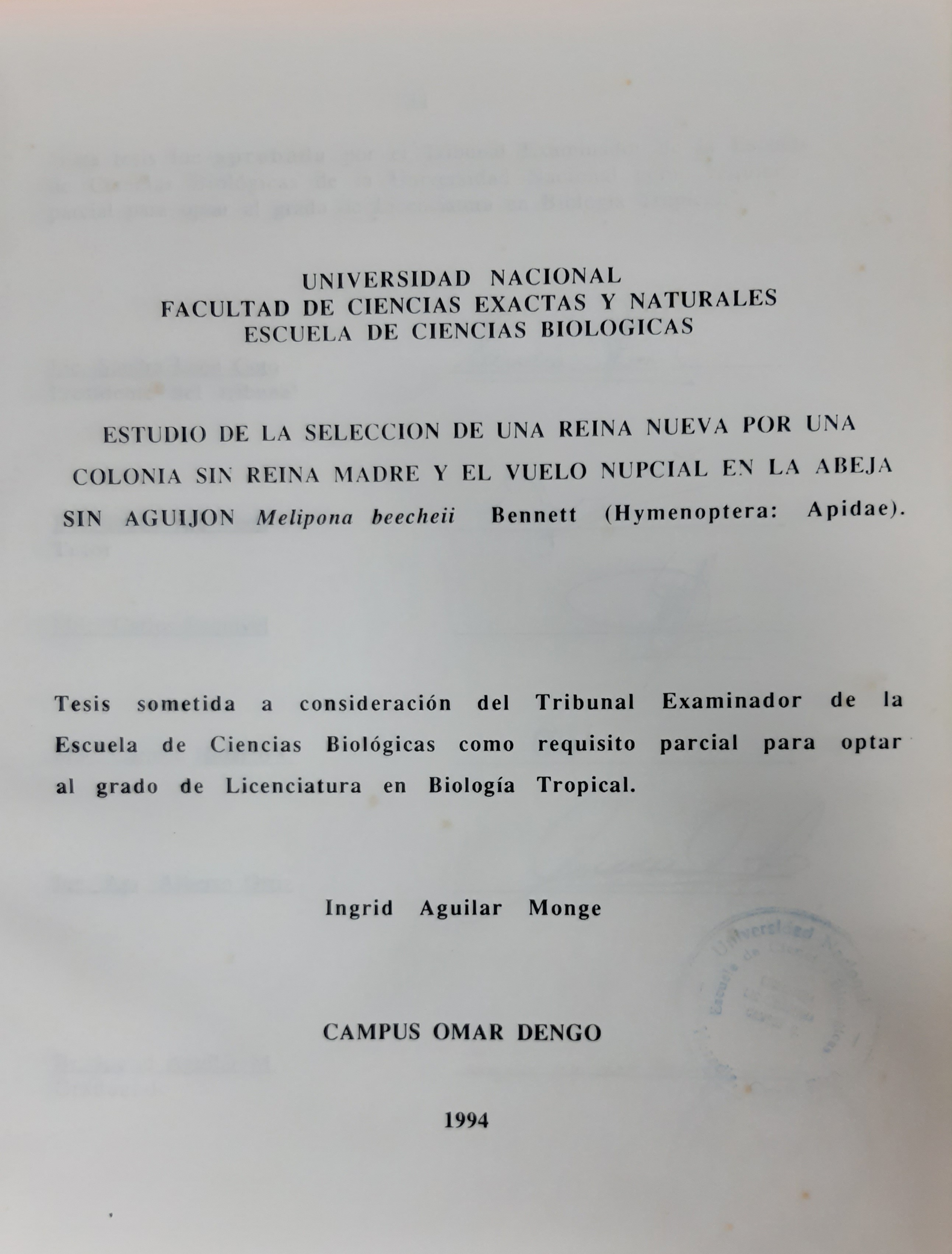 Aguilar Monge, I. (1994). Estudio de la selección de una reina nueva por una colonia sin reina madre y el vuelo nupcial en la abeja sin aguijón Melipona beecheii Bennett (Hymenoptera : Apidae). [Tesis de Licenciatura. Universidad Nacional, Costa Rica].