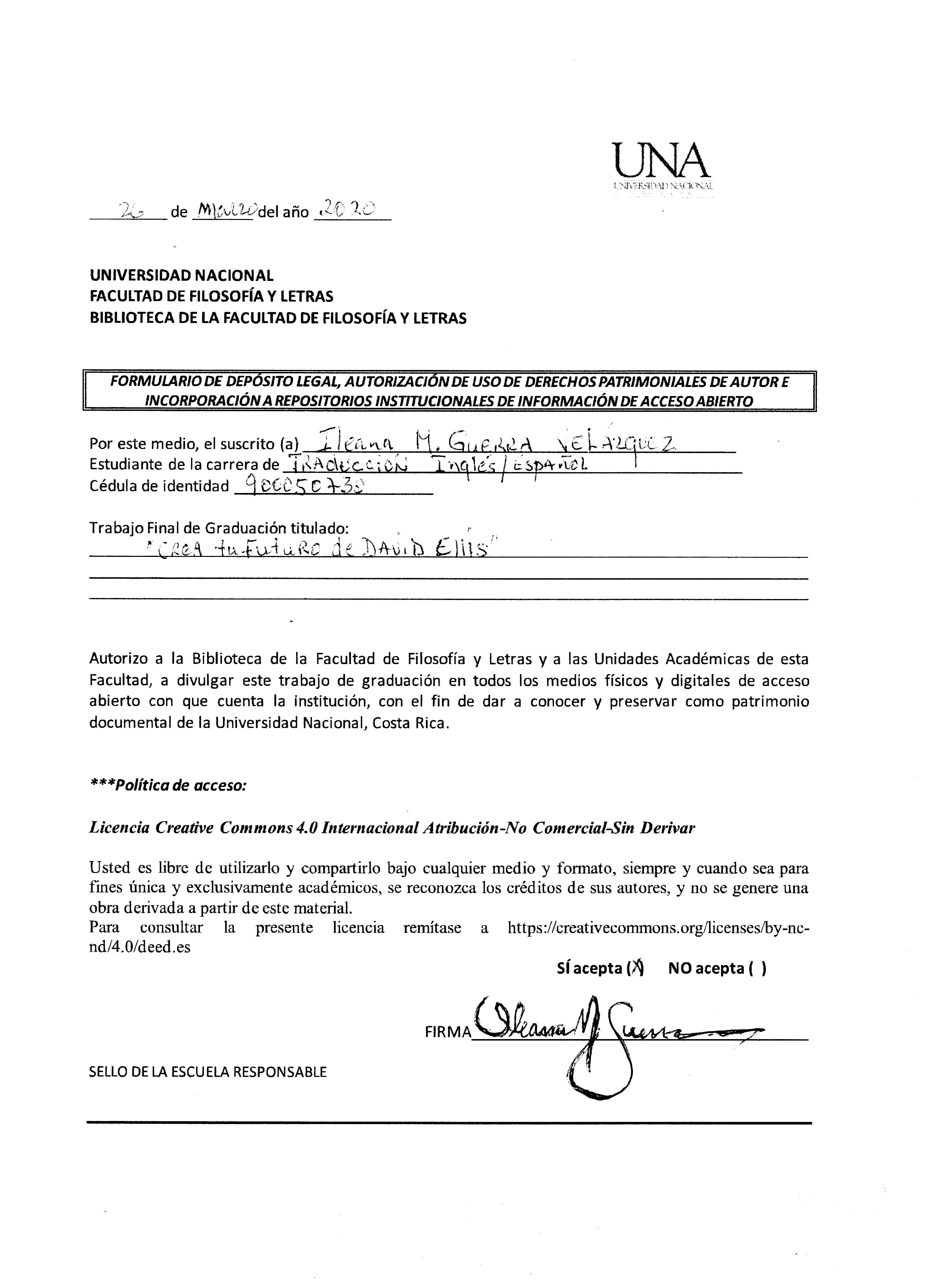 El estudio consta en dos partes: la traducción del libro “Creating your future” por Dave Ellis y una “Memoria”, por lo cual analiza aspectos teóricos en el proceso de la traducción. Uno de los objetivos de la “Memoria” es proponer recomendaciones y herramientas de diversas estrategias de traducción para trasmitir el significado exacto del mensaje en la lengua terminal en la traducción de textos de pensamiento positivo y autoayuda. En la “Memoria” se estudia tres temas importantes: el análisis general del texto, los recursos lingüísticos que caracterizan el estilo del texto y los procedimientos expositivos del autor. En la metodología de investigación se utiliza un método de traducción semántico y comunicativo; además, posee un género discursivo didáctico, que se basó en la teoría de Newmark, Nidia y Taber. Algunas conclusiones, el traductor debe pasar por el procedimiento en la toma de decisiones sobre la lectura y la escritura del texto original, por lo que debe analizar y consultar fuentes de información necesaria para la traducción.