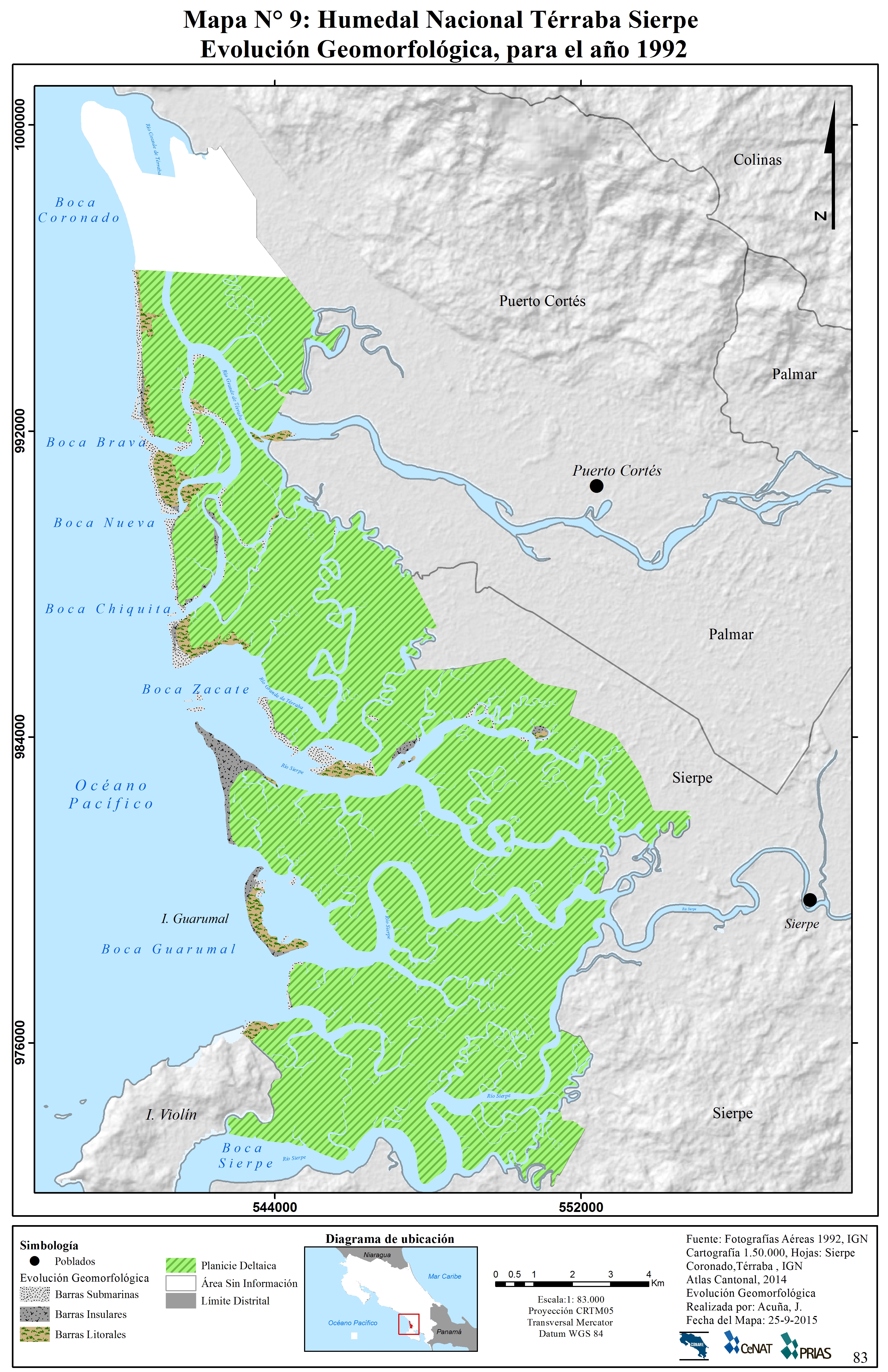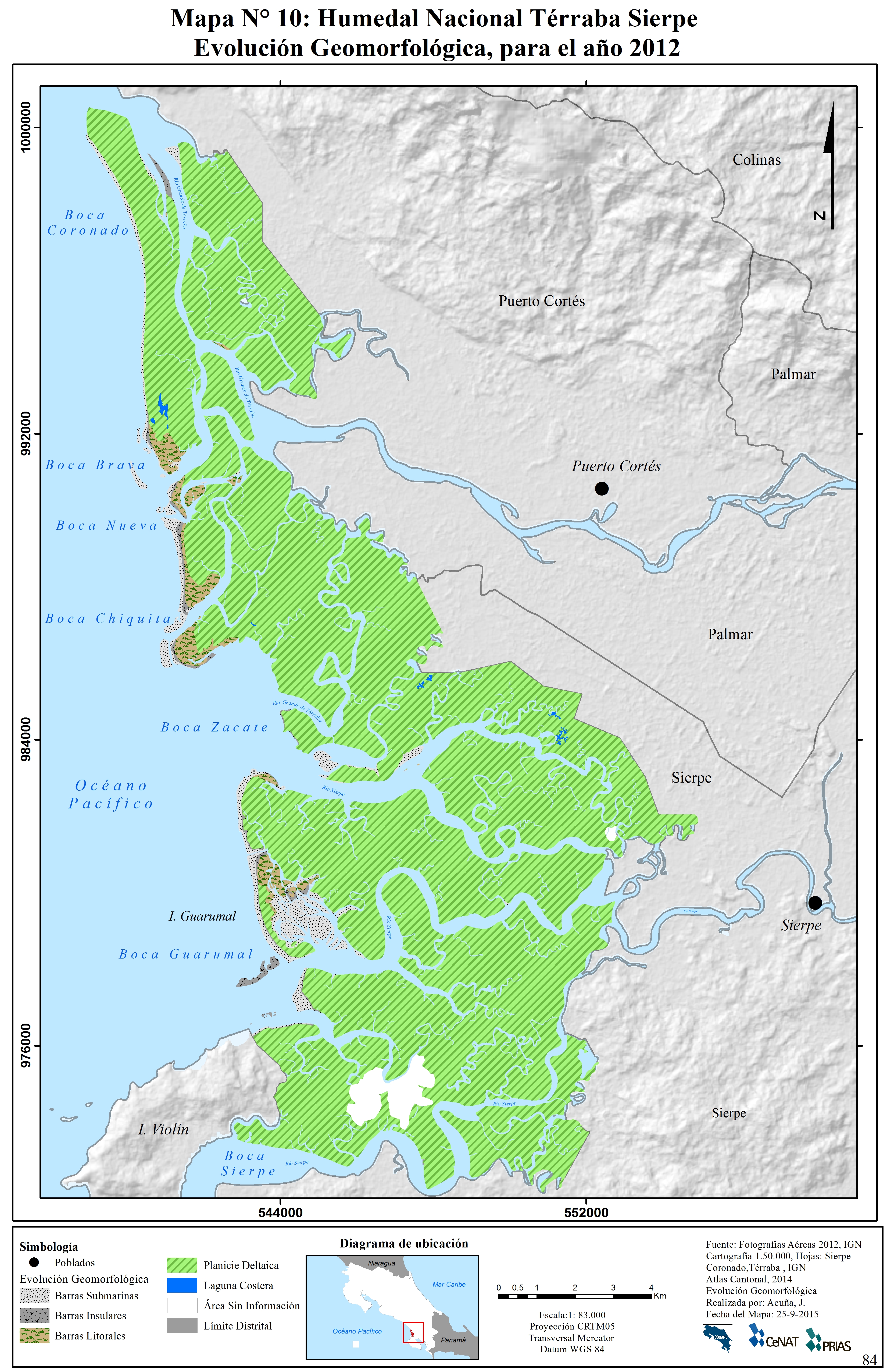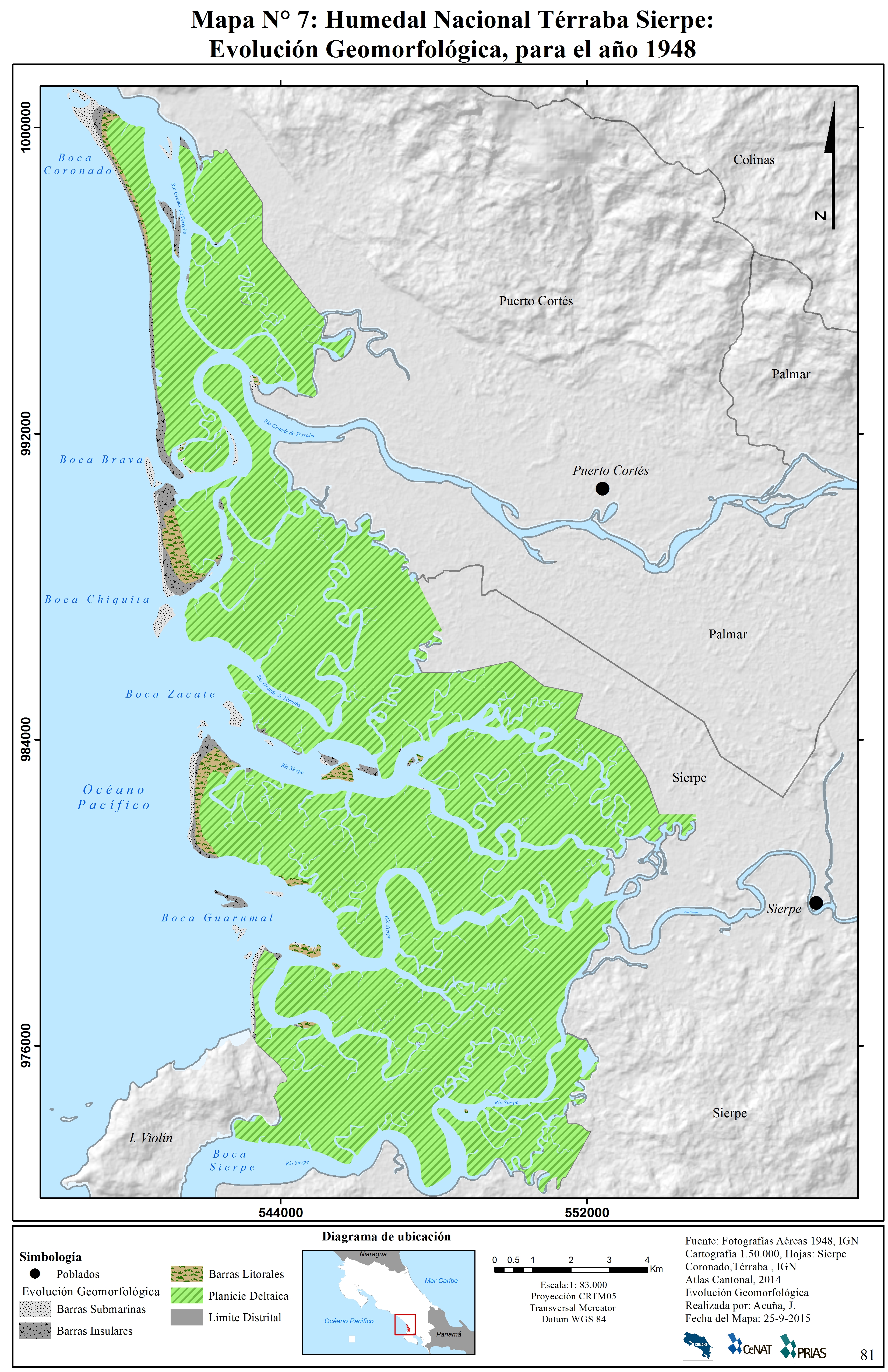 Wetlands in Costa Rica cover about 5% of the territory, where the Humedal Nacional Térraba Sierpe (HNTS) is one of the most important because It has the largest extension in the country. The HNTS also features extensive coverage of manglárica vegetation that provides important ecosystem services, however, the specific conditions that this type of vegetation requires for its growth and development, makes it susceptible to any change or modification in the environment. Among the impacts that have influenced this ecosystem, through the analysis space-time of photographic inputs and field verification it was determined that in the period 1948-2012 there were changes in land uses, especially the replacement of manglaric forests to give way to agricultural activities such as rice cultivation, pastures with forestry, the African palm, lands discovered by deforestation, as well as There is also extraction of bark to make charcoal and tannins, in addition to developing mariculture ponds .. On the other hand, natural processes have also affected this wetland, where in the changes have been observed in the morphology of the coastline in the deltaic system in the last 60 years Térraba-Sierpe, which are associated with erosion and sediment deposition, which they depend on the activities in the upper and middle basins (Térraba and Sierpe rivers). This dynamic has resulted in the creation and disappearance of coastal morphologies such as coastal barriers, sand bars and islands, which has also caused mangrove loss. Finally, it was found that land uses and geomorphological dynamics they had different effects on manglárica coverage in the study period. For the years 1948-1972 there is a mangrove loss to a greater extent due to changes geomorphological; while for the case of the period 1972-1992 both factors influence similarly on the loss of mangrove cover; and for the period that includes 1992-2012 there is a recovery of the manglárica vegetation, where the colonization of the different mangrove species in consolidated sediments provides a larger recovered area compared to the colonization of these species in areas previously dominated by uses of the land.