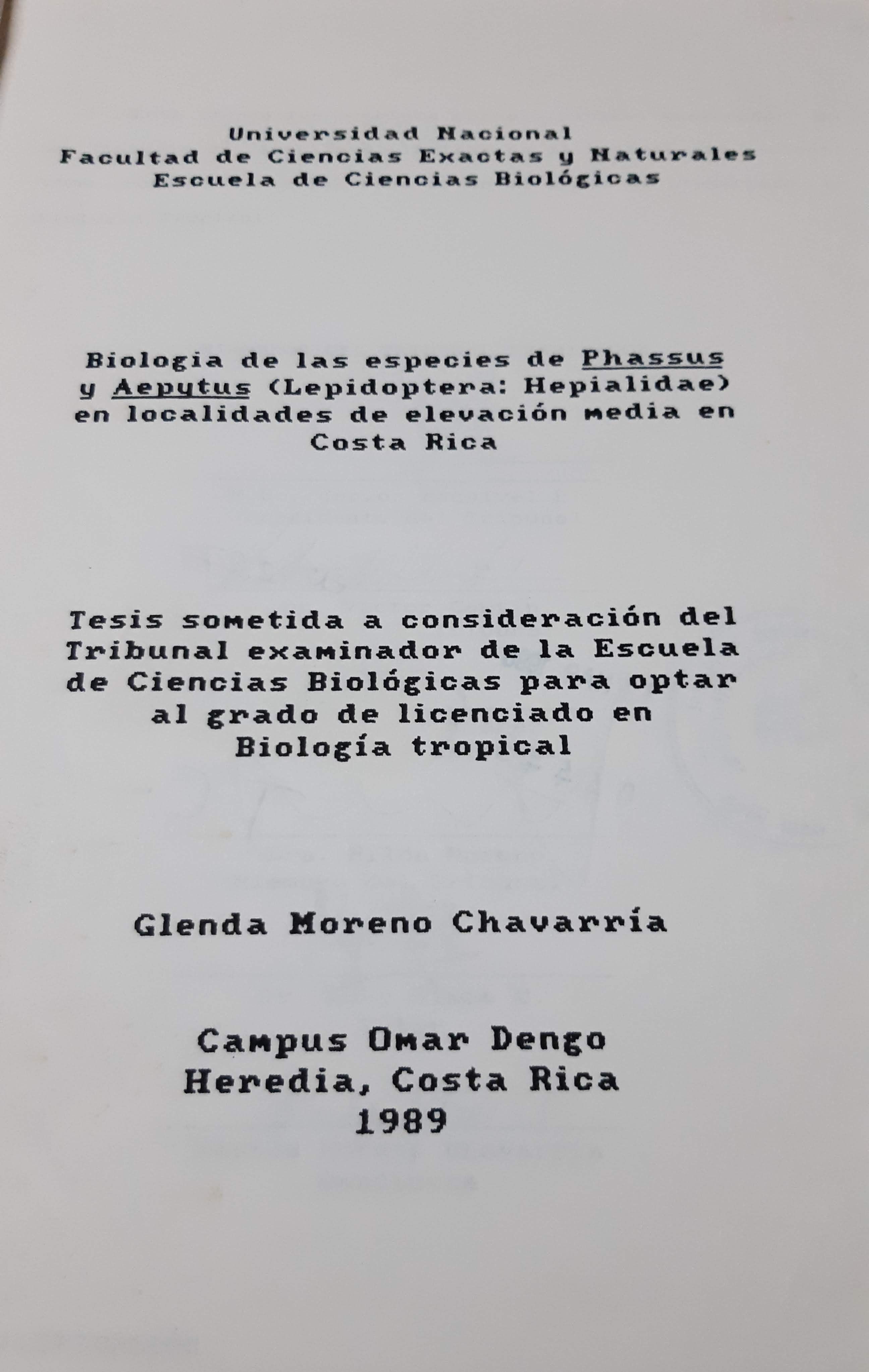 Biología de las especies de phassus y Aeputus (Lepidoptera Hepialidae) en localidades de elevación media en Costa Rica