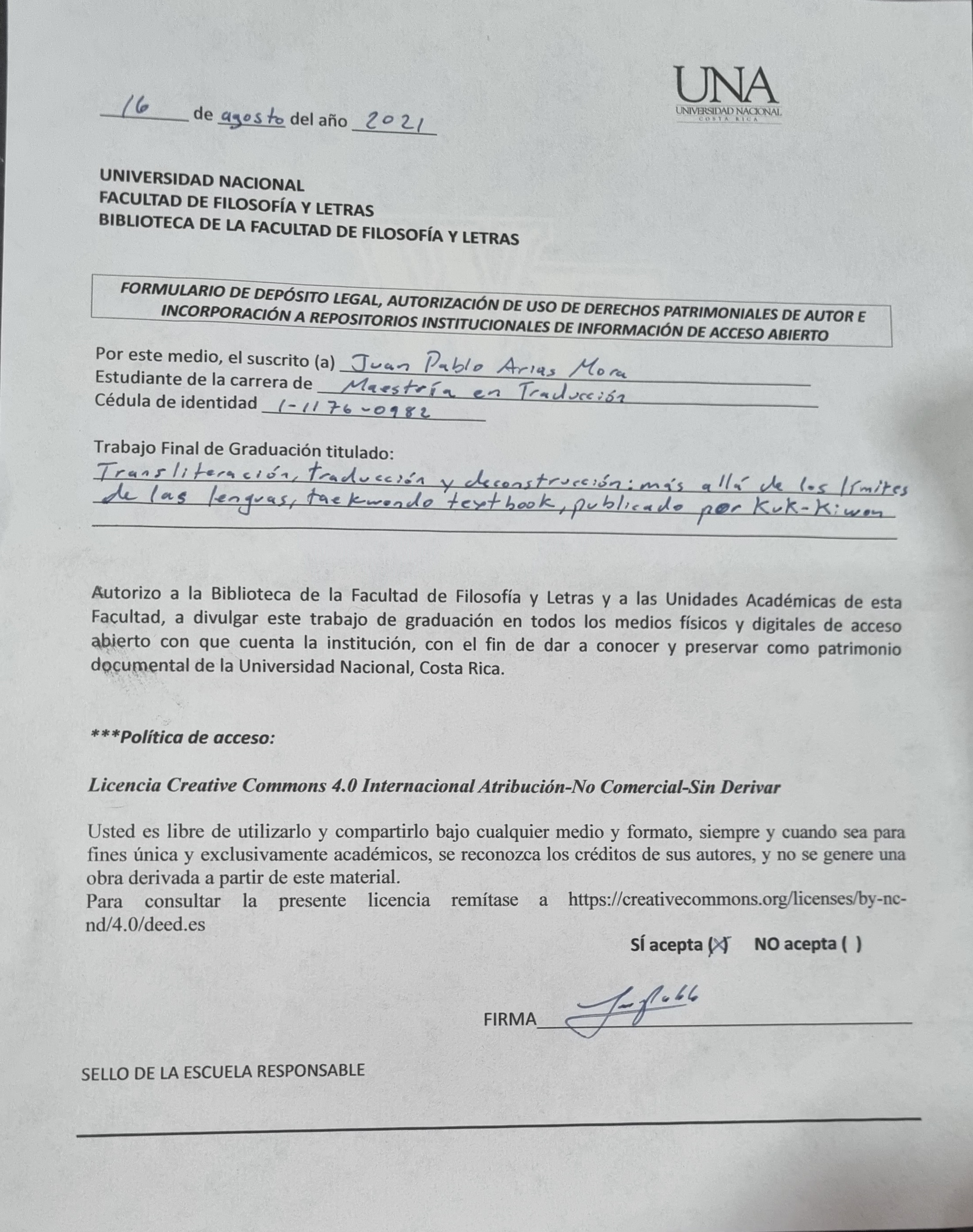 The present graduation work consists of the translation and research report of the text Taekwondo Textbook, published by the Kuk-Kiwon, the governing body of taekwondo worldwide. The work proposes a system of transliteration of Korean terms based mainly on direct phonetic transliteration taken from the Korean script, but taking into account other linguistic and cultural factors that are reflected in the transliteration samples obtained in Costa Rica. This creative transliteration is analyzed as a subversive process that forces the rethinking of the concept of language, in this case, of written language. This is based on Jacques Derrida's theory of deconstruction, which establishes language as a creator of false worlds, promoting the deconstruction of reason through the deconstruction of language, breaking the supposed relationship between the signified and the signifier. In the transliteration proposal, a negotiation between naturalization and strangeness is carried out, which results in a creation of the translator's own that seeks to solve the problem of inconsistency and lack of uniformity in the current use of terms in Costa Rica.