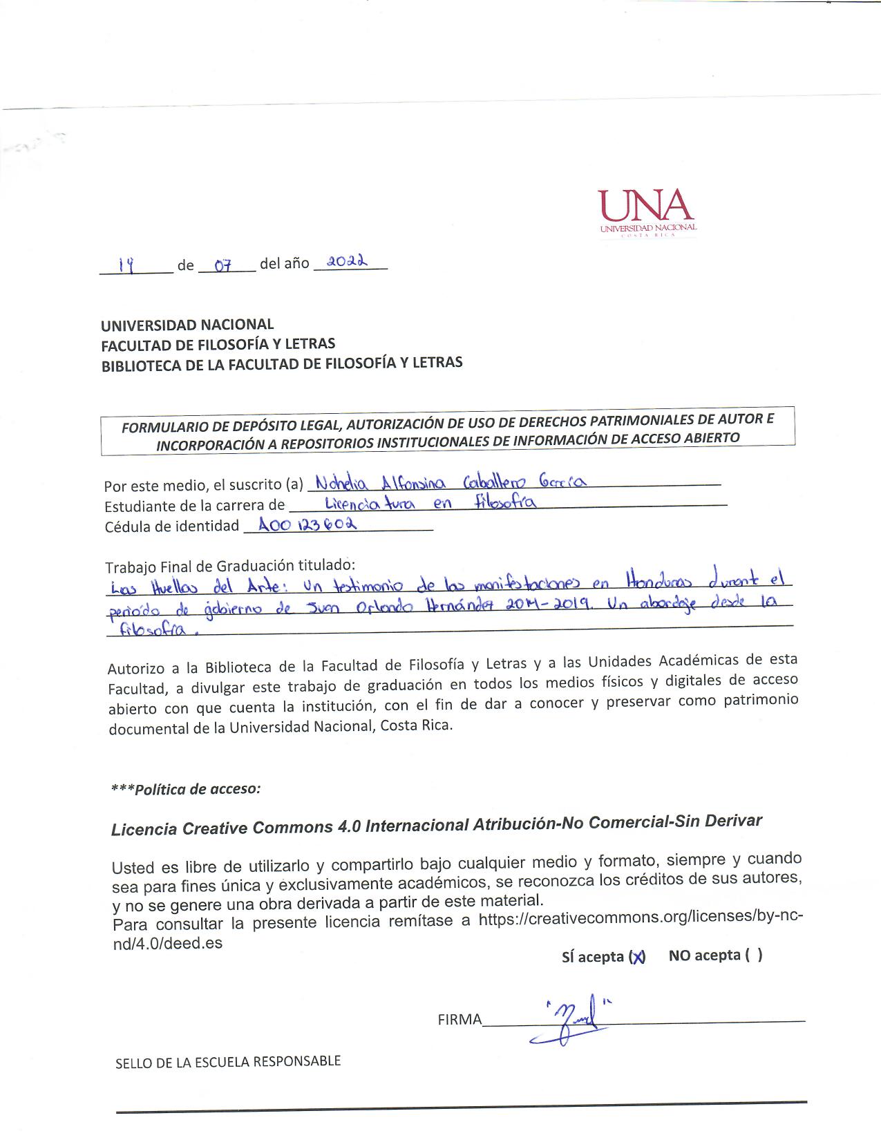 Las huellas del arte : un testimonio de las manifestaciones en Honduras durante el periodo de gobierno de Juan Orlando Hernández 2014-2019. Un abordaje desde la filosofía.