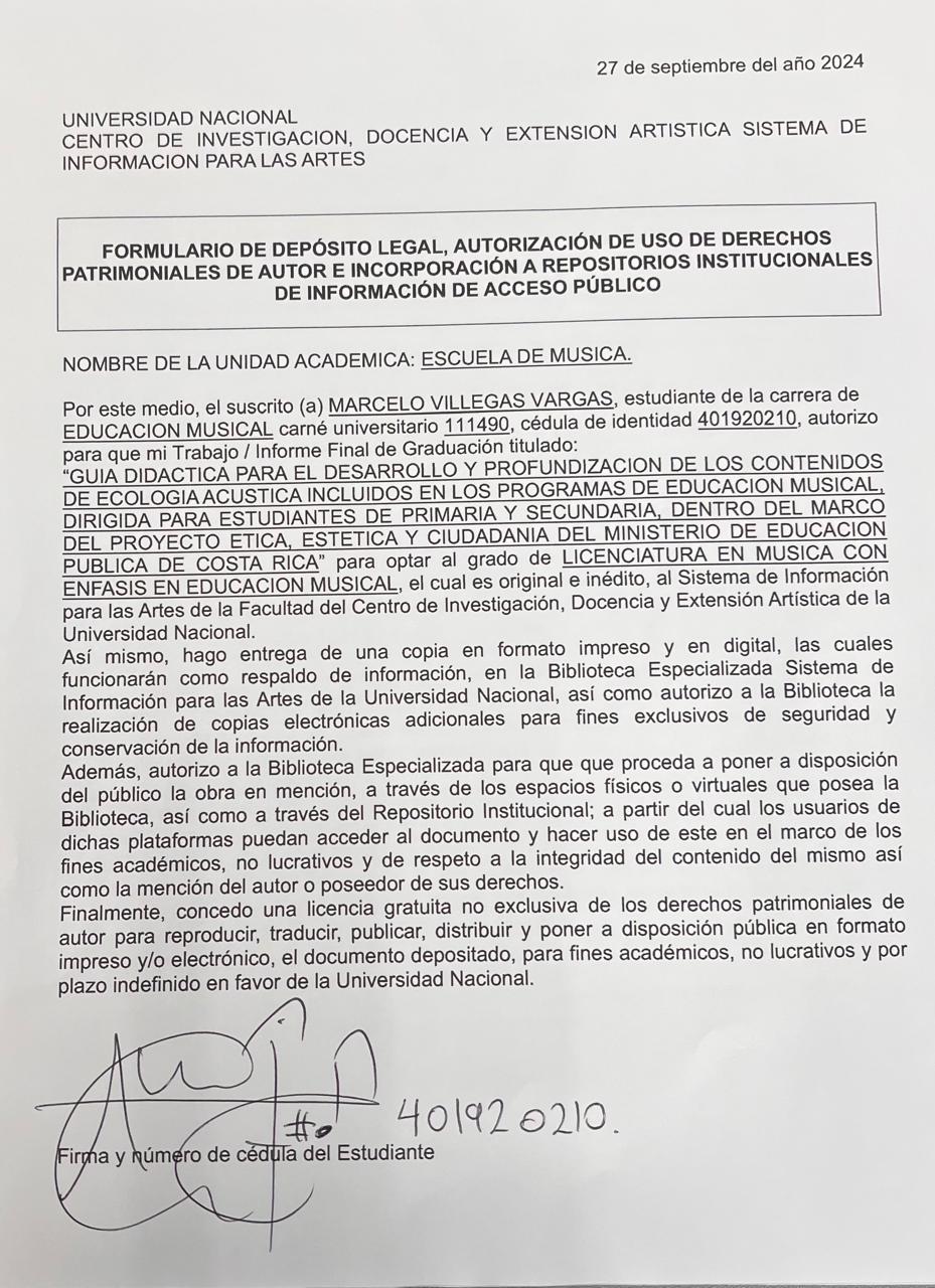Guía didáctica para el desarrollo y profundización de los contenidos de ecología acústica incluidos en el Programa de Estudio de Educación Musical, dirigida para estudiantes de primaria y secundaria, dentro del marco del Proyecto Ética, Estética y Ciudadanía del Ministerio de Educación Pública de Costa Rica