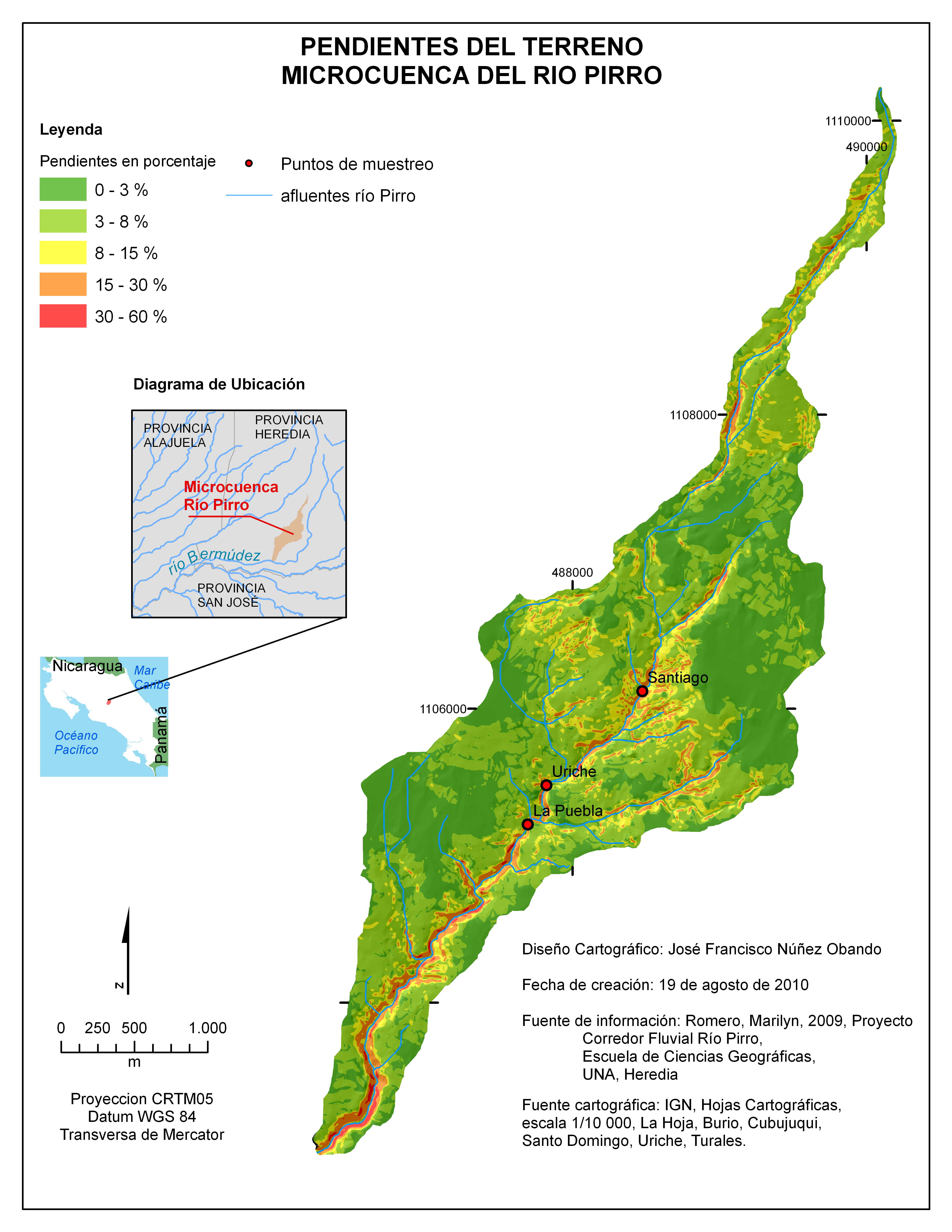 Este mapa contiene la cartografía base dentro del límite de la microcuenca del Río Pirro. Proyecta los pendientes en porcentajes y los puntos de muestreo.