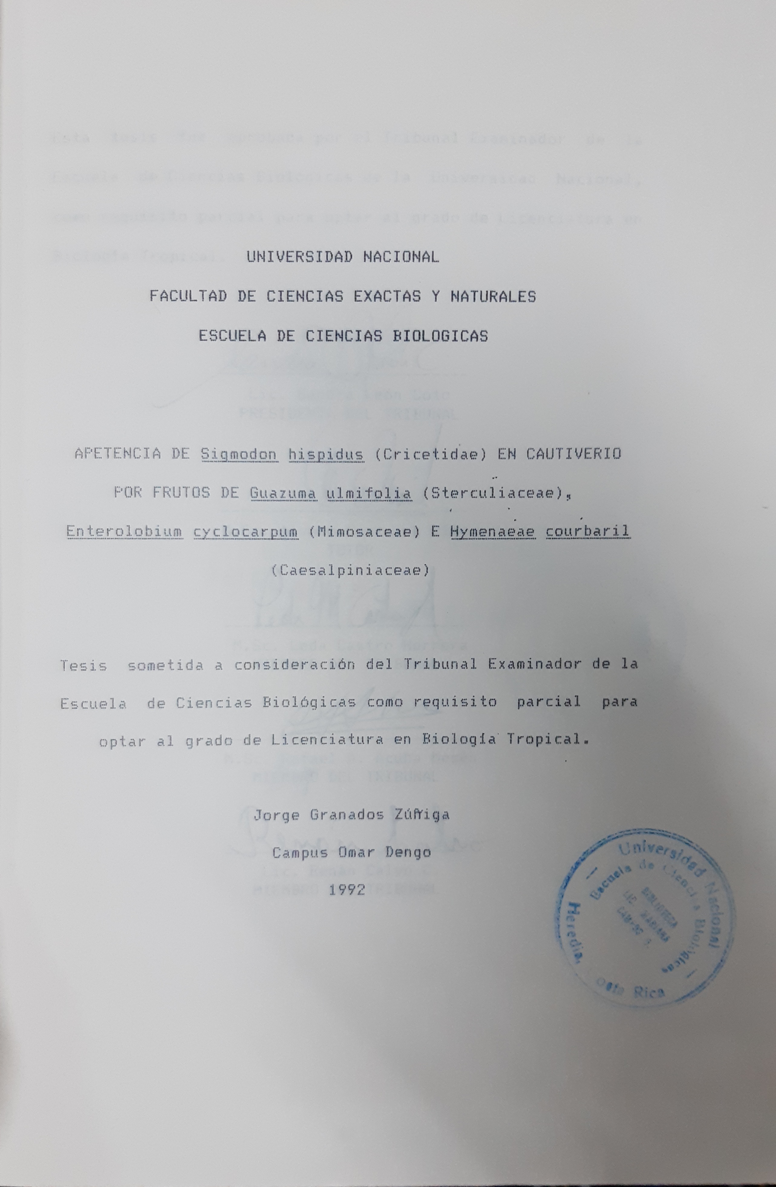 Granados Zúñiga, J. (1992). Apetencia de Sigmodon hispidus (Cricetidae) en cautiverio por frutos de Guazuma ulmifolia (Sterculiaceae), Enterolobium cylocarpum (Mimosaceae) E Hymenaeae Courbaril (Caesalpiniaceace). [Tesis de Licenciatura. Universidad Nacional, Costa Rica].