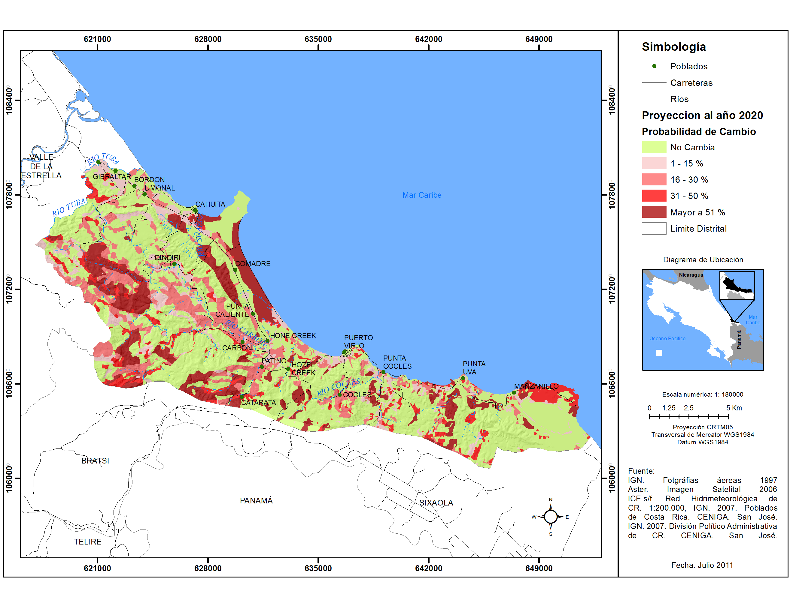 Se presenta en el mapa la proyección en porcentaje de la zona Caribe, Costa Rica para el año 2020.